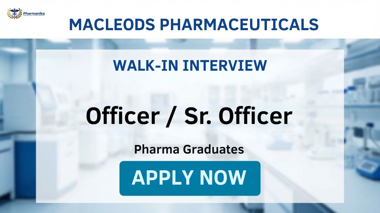 This Walk-In Drive is a great opportunity for pharma professionals looking for Quality Control Jobs at Macleods Indore Plant. Candidates with relevant experience can attend this Walk-In Drive for Quality Control Jobs and explore Officer and Sr. Officer roles at Macleods Pharmaceuticals in Indore.